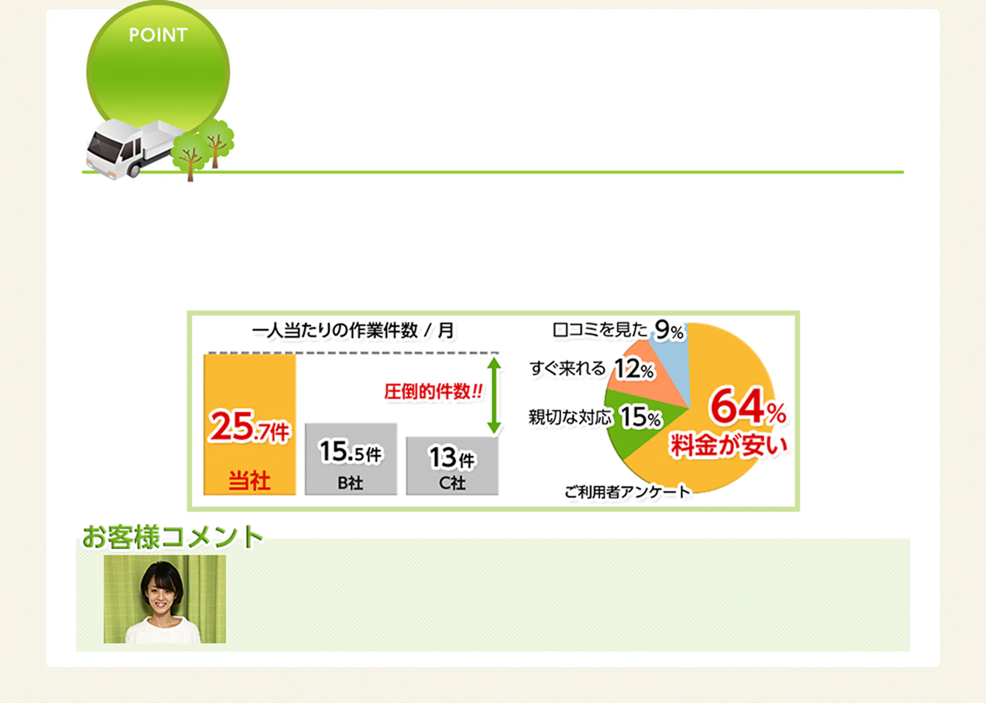 各地の拠点から訪問するため移動にかかるコストを抑え、また熟練したスタッフでの作業となりますので、作業時間の大幅カットで月に約25件以上の現場を回る事が出来ます。その為、お客様に低価格として還元をしております。
